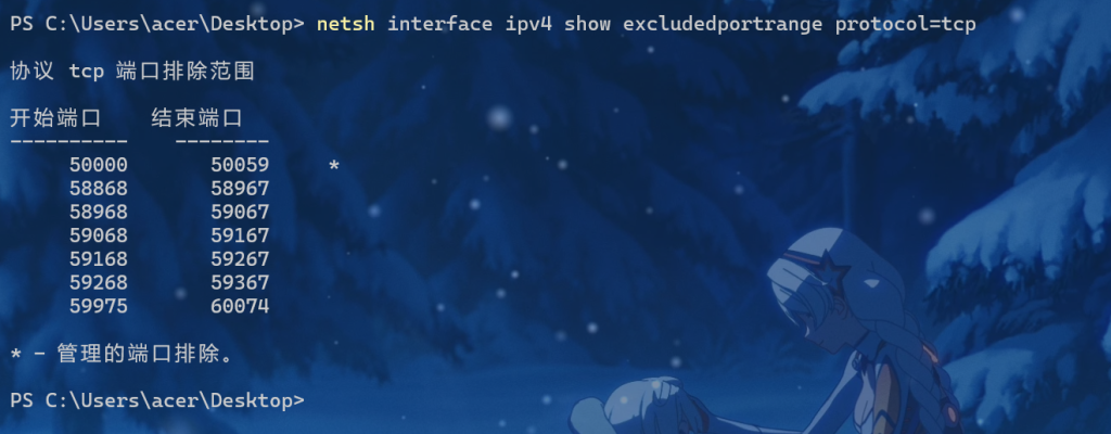 netsh interface ipv4 show excludedportrange protocol=tcp