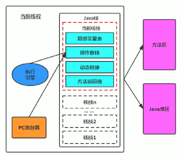(3)当然方法在执行的过程中,执行引擎有可能会通过存储在局部变量表中的对象引用准确定位到存储在Java堆区中的对象实例信息以及通过对象头中的元数据指针定位到目标对象的类型信息。