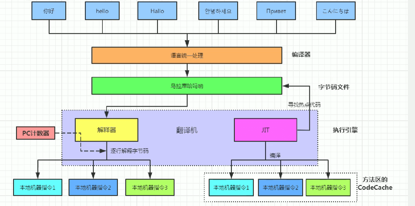 那么,如果想要让一个Java程序运行起来,执行引擎(Execution Engine)的任务就是将字节码指令解释/编译为对应平台上的本地机器指令才可以。简单来说,JVM中的执行引擎充当了将高级语言翻译为机器语言的译者。
