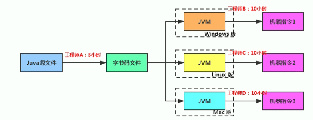 JVM设计者们的初衷仅仅只是单纯地为了满足Java程序实现跨平台特性,因此避免采用静态编译的方式直接生成本地机器指令,从而诞生了实现解释器在运行时采用逐行解释字节码执行程序的想法。