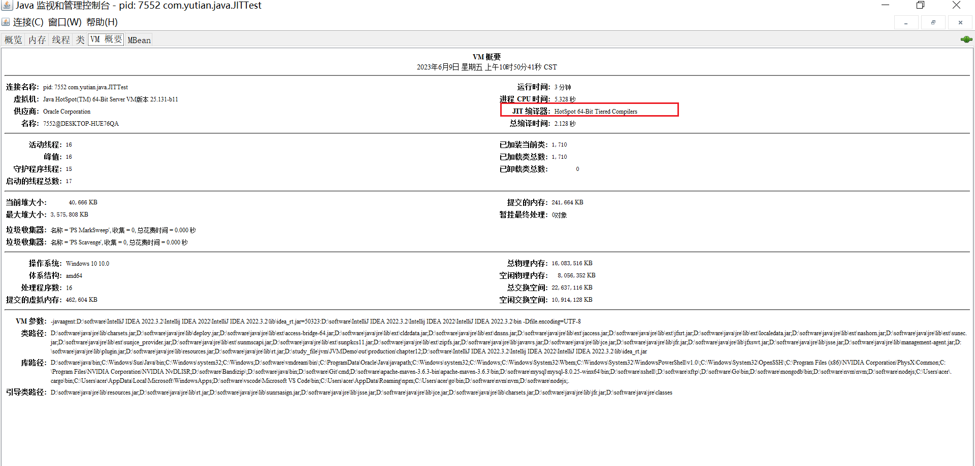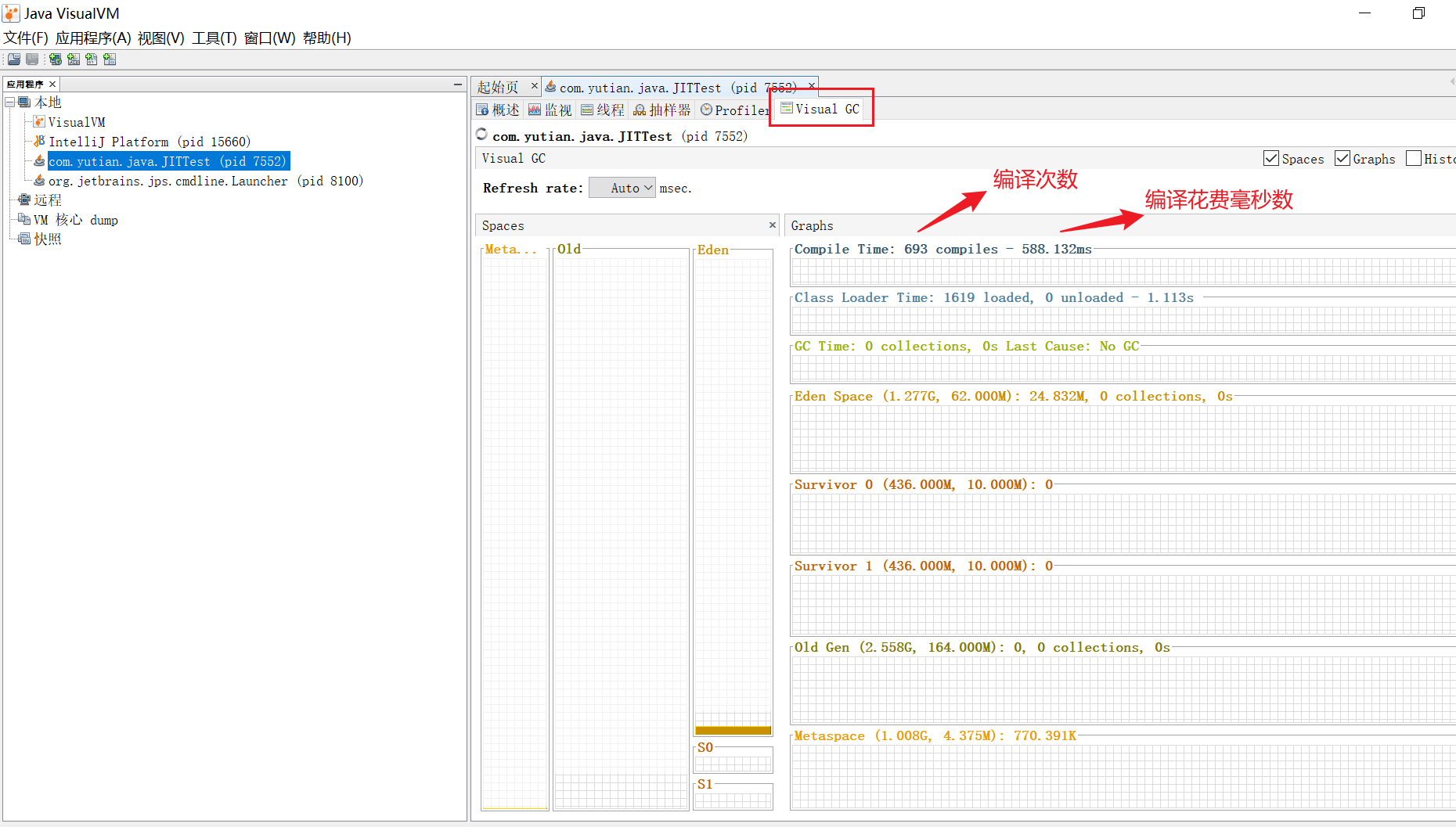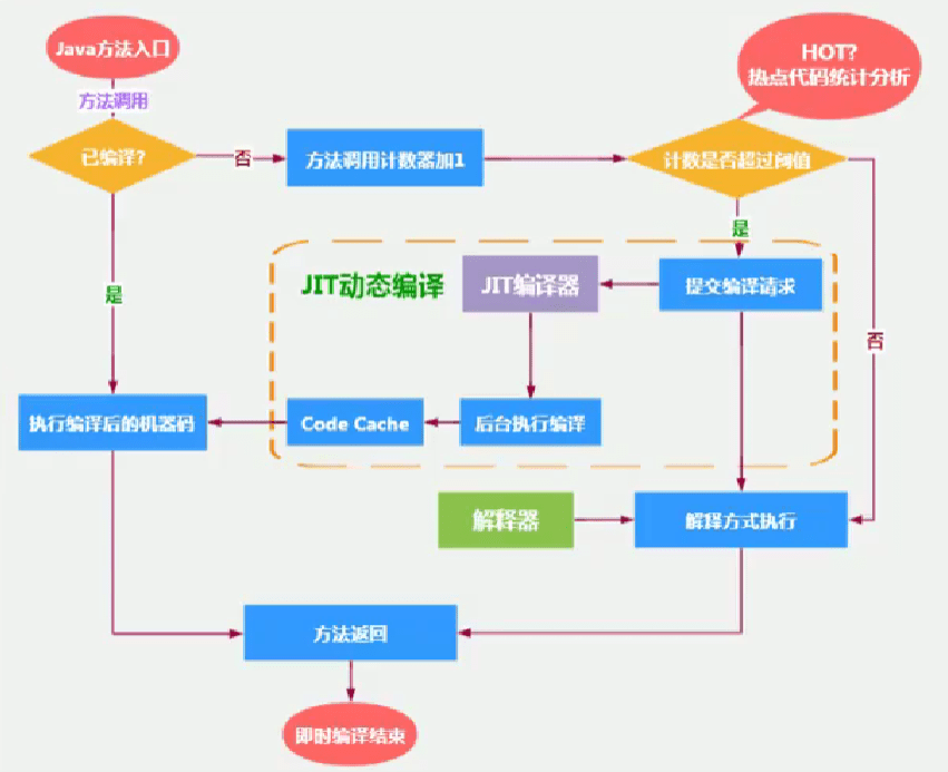 • 在方法区中就可以存储JIT代码缓存,即时编译器将字节码指令翻译为机械指令能够缓存,若频繁调用,能直接调用机械指令,效率更高。