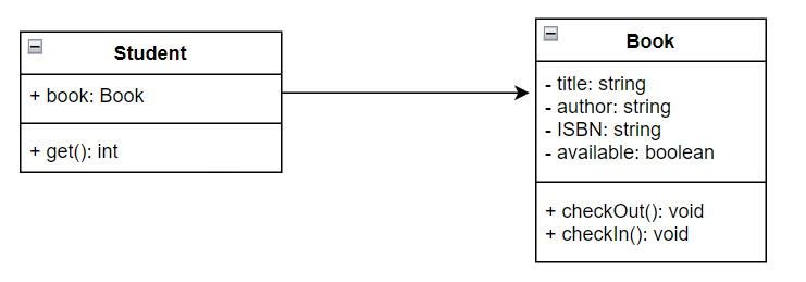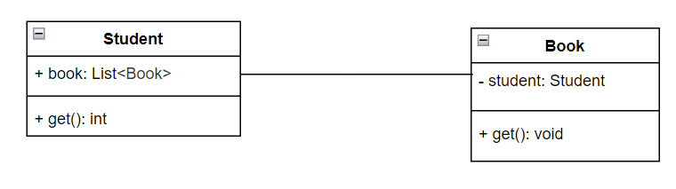 在UML类图中,双向关联用一个不带箭头的直线表示。上图中在Student类中维护一个List<Book>,表示一个学生可以借阅多本书;在Book类中维护一个Student类型的成员变量表示这本书被哪个学生所借阅。