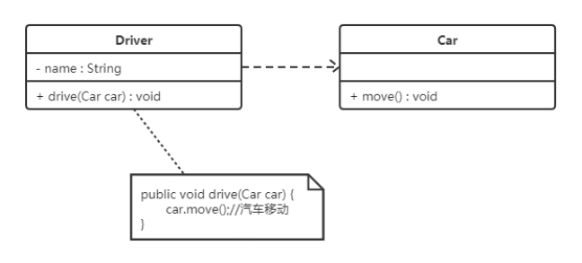 - 例如,一个方法中使用了另一个类的对象作为参数,表示依赖关系。