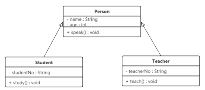在 UML 类图中,泛化关系用带空心三角箭头的实线来表示,箭头从子类指向父类。在代码实现时,使用面向对象的继承机制来实现泛化关系。例如,Student 类和 Teacher 类都是 Person 类的子类,其类图如下图所示: