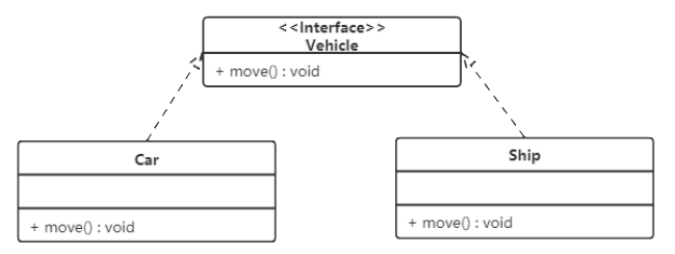 实现关系是接口与实现类之间的关系。在这种关系中,类实现了接口,类中的操作实现了接口中所声明的所有的抽象操作。