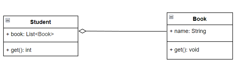 - 聚合关系也是通过成员对象来实现的,其中成员对象是整体对象的一部分,但是成员对象可以脱离整体对象而独立存在。例如,学生与书本的关系,学生有书籍。