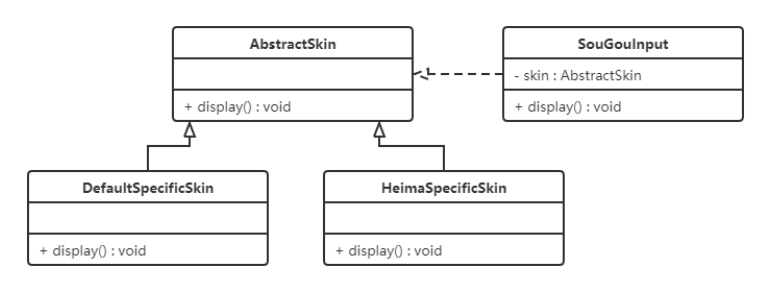 可以为其定义一个抽象类(AbstractSkin),而每个具体的(DefaultSpecificSkin和HeimaSpecificSkin)是其子类。用户可以根据需要选择或者增加新的实现,而不需要修改原代码,所以它是满足开闭原则的。