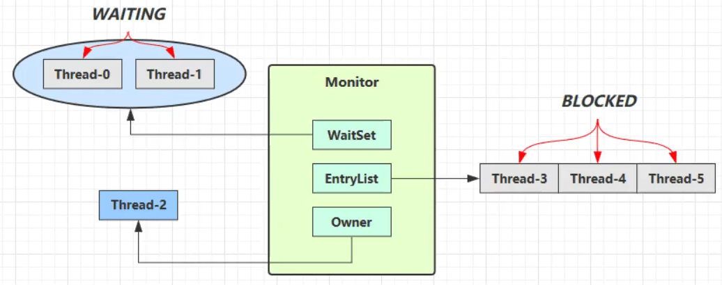 - Owner 线程发现条件不满足,调用 wait 方法,即可进入 WaitSet 变为 WAITING 状态