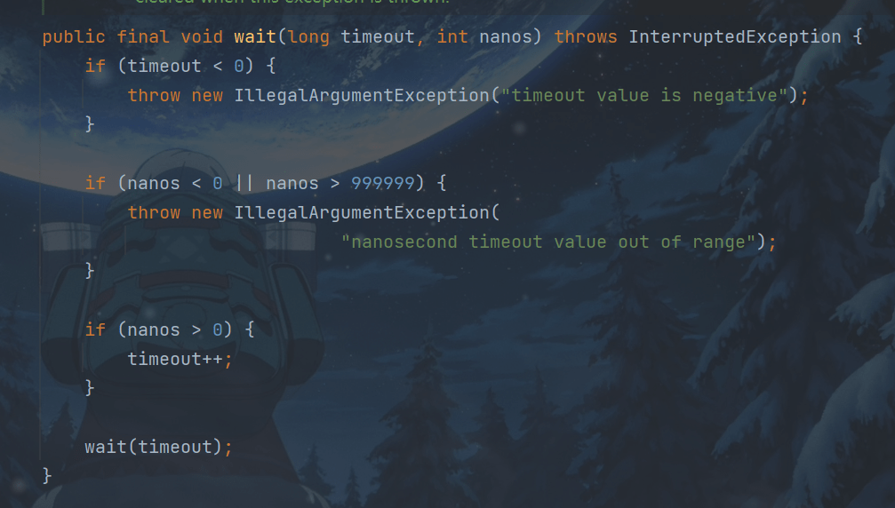 在其内部调用的是 wait(long timeout)函数,如下代码只有在 nanos>0时才使参数timeout 递增 1。