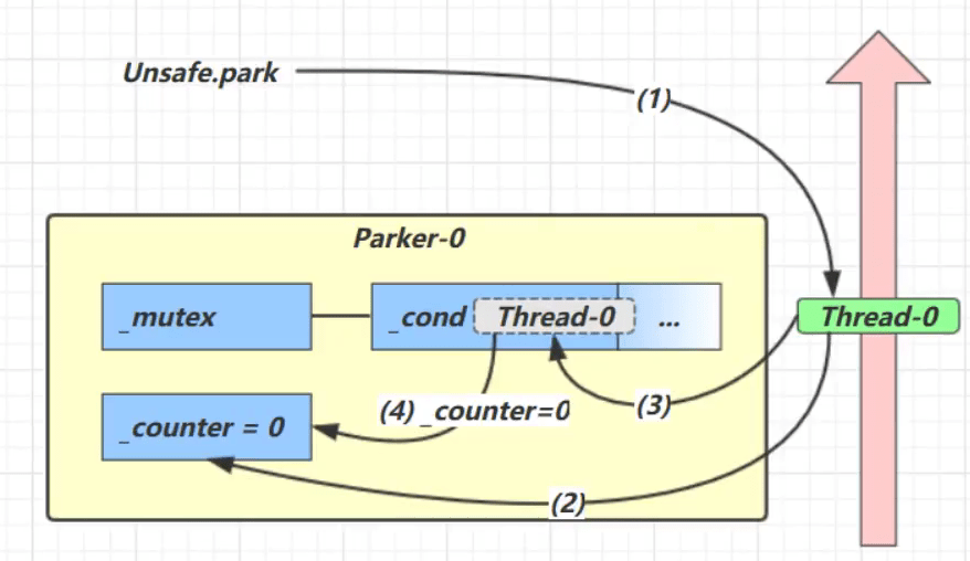 - 调用 park ,_counter为0,那么暂停,进入_cond,如果_counter 为1,那么继续前进,同时,让_counter 变为0。