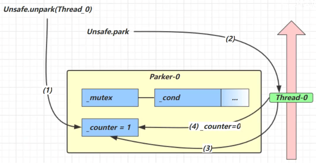 - 调用 unpark,让_counter 变为1,如果这时线程还在_cond ,就唤醒他,如果这时线程还在运行,那么下次他调用 park 时,_counter 已经变为1了,不需停留继续前进,多次调用 unpark一样, _counter 都变为1。
