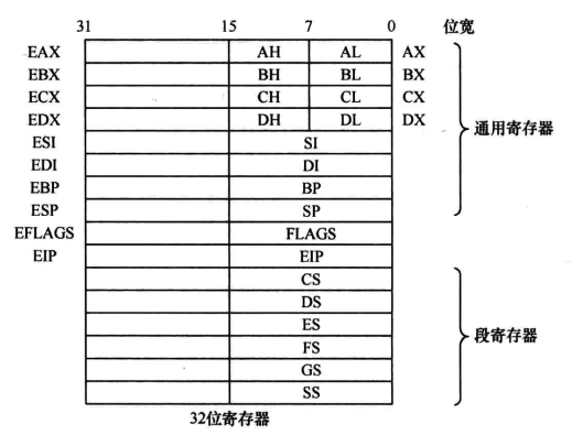 除段寄存器外,通用寄存器、指令指针寄存器、标志寄存器都由原来的16位扩展到了32位。段寄存器用16位就够用了。