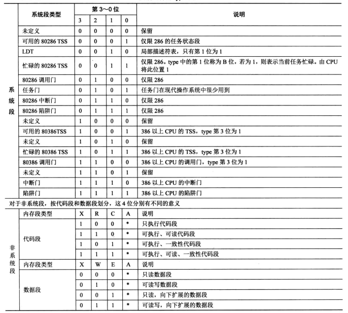 type字段是要和S字段配合在一起才能确定段描述符的确切类型,只有 S 字段的值确定后,type字段的值才有具体意义。