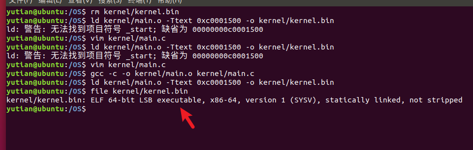 ld是用来链接(link)目标文件 main.o 并生成一个输出文件 kernel.bin 的命令。