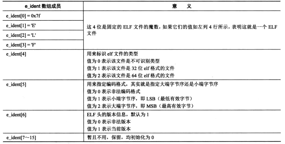 1.e_ident[16] 是16字节大小的数组,用来表示ELF字符等信息。开头的4B是魔数0x7f以及字符串ELF的ASCII码:0x45 0x4c 0x46,如图: