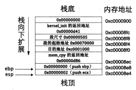 当调用kernel_init函数时,当时的栈指针是0xc00008fc,所以kernel_init 的返回地址被存储在 0xc00008fc 处。栈中地址 0xc00008f8 处的内容是提供给函数 mem_cpy的第三个参数,即size。地址较低的0xc00008f4处是它的第二个参数,即src地址,0xc00008f0处是它的第一个参数,即dst。