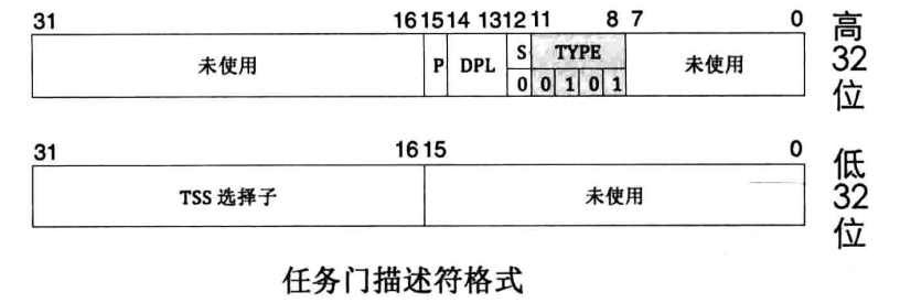 - 任务门:以任务状态段TSS为单位,用来实现任务切换,它可以借助中断/指令发起。当中断发生时,如果对应的中断向量号是任务门,则会发起任务切换。也可以像调用门那样,用call/jmp指令后接任务门的选择子/任务TSS的选择子。