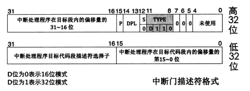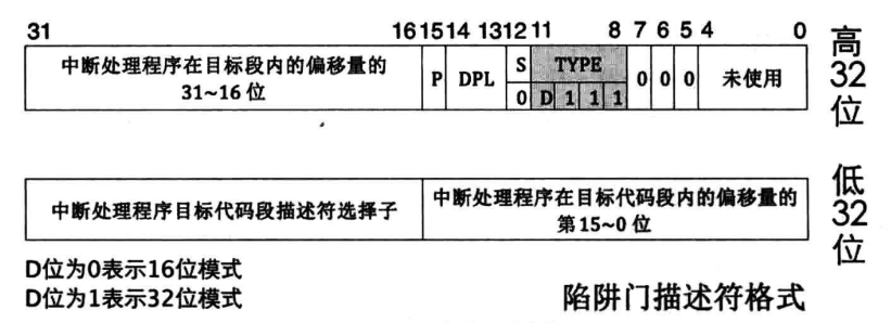 - 门描述符一共有4种:任务门描述符、中断门描述符、陷阱门描述符和调用门描述符。
