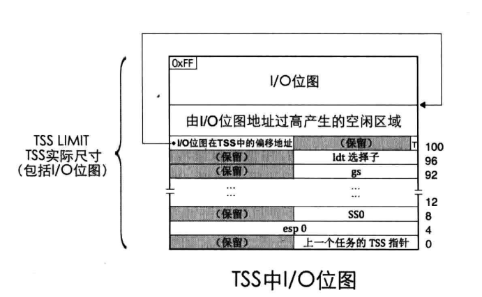 TSS的实际尺寸并不固定,若存在IO位图,则TSS大小 = IO位图偏移地址 + 8192 + 1字节,结尾1B是最后的0xff;若无,则TSS大小 = 104字节。