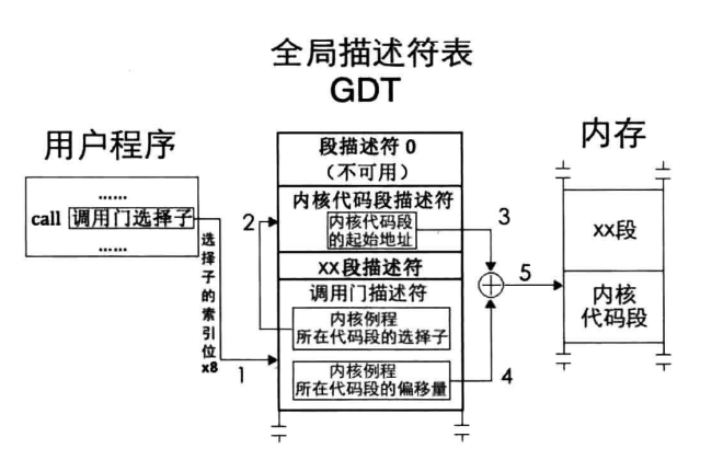 - 调用门:call和jmp指令后接调用门选择子为参数,以调用函数例程的形式实现从低特权级变成高特权级转移,可以来实现系统调用。call指令使用调用门可以实现向高特权级代码转移,jmp指令使用调用门只能向平级特权代码转移。