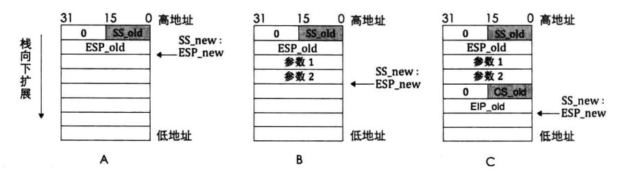 在使用新栈后,将上一步中临时保存的SS_old和ESP_old压入新栈中【用于恢复栈,如果是平级转移则不需要保存旧栈,因为压根不需要换栈】。