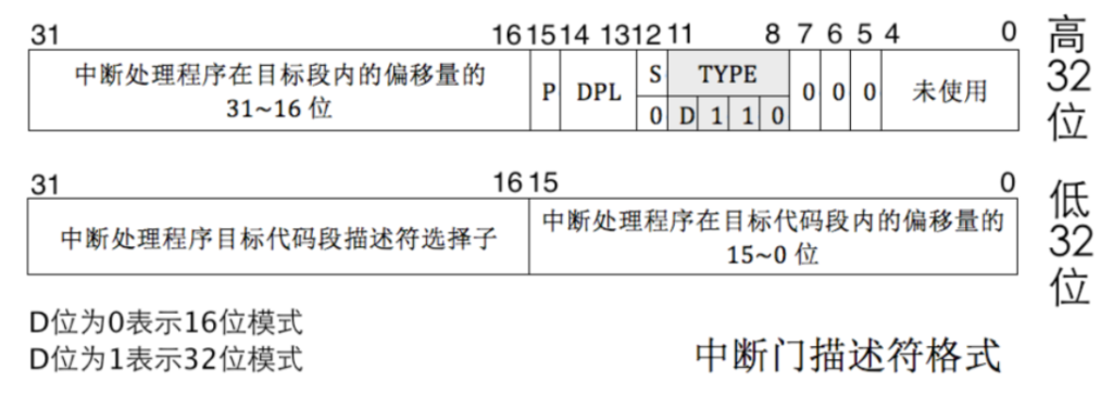 在门描述符中有个P位,所以,咱们将来在构建IDT时,记得把P位置0,这样就表示门描述符中的中断处理程序不在内存中。