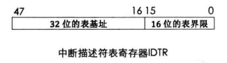 在CPU内部有个中断描述符表寄存器(Interrupt Descriptor Table Register, IDTR),该寄存器分为两部分:第0~15位是表界限,即IDT大小减1,第16~47位是IDT的基地址,和之前介绍的GDTR是一样的原理。中断描述符表地址要加载到这个寄存器中,只有寄存器IDTR指向了IDT,当CPU接收到中断向量号时才能找到中断向量处理程序,这样中断系统才能正常运作。