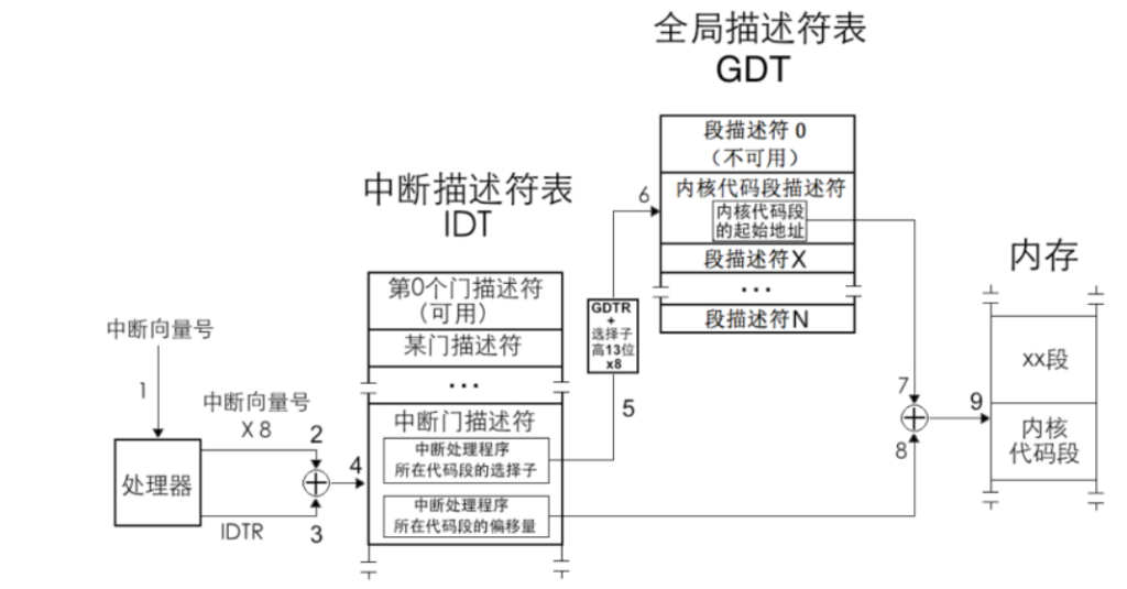 中断描述符表(Interrupt Descriptor Table,IDT)是保护模式下用于存储中断处理程序入口的表,当CPU接收一个中断时,需要用中断向量在此表中检索对应的描述符,在该描述符中找到中断处理程序的起始地址,然后执行中断处理程序。