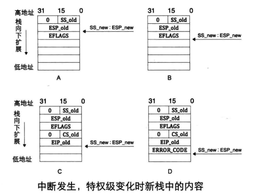注意,由于CS加载了新的目标代码段选择子,处理器不管新的选择子和任何段寄存器(包括 CS)中当前的选择子是否相同,也不管这两个选择子是否指向当前相同的段,只要段寄存器被加载,段描述符缓冲寄存器就会被刷新,处理器都认为是换了一个段,属于段间转移,也就是远转移。所以,当前进程被中断打断后,为了从中断返回后能继续运行该进程,处理器自动把CS和EIP的当前值保存到中断处理程序使用的栈中。不同特权级别下处理器使用不同的栈,至于中断处理程序使用的是哪个栈,要视它当时所在的特权级别,因为中断是可以在任何特权级别下发生的。除了要保存CS、EIP外,还需要保存标志寄存器EFLAGS,如果涉及到特权级变化,还要压入SS和ESP 寄存器。