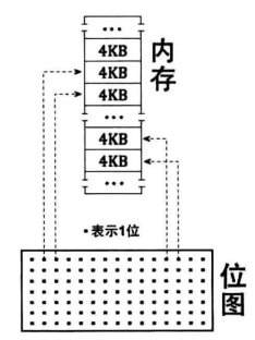 位图中的每一位有两种状态,即 0 和 1,若用位图来管理内存,位图中的每一位都将表示实际物理内存中的4KB,也就是一页,即位图中的一位对应物理内存中的一页,如果某位为0,表示该位对应的页未分配,反之如果某位为1,表示该位对应的页已经被分配出去,在将该页回收之前不可再分配。