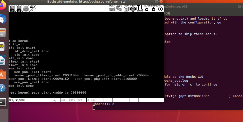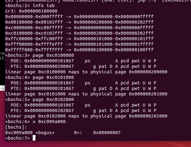 在bochs的输出中,无论地址是虚拟地址,还是物理地址,只要其是连续的,bochs就会合并到一起输出。因此,虚拟地址范围0xc0100000~0xc0102fff所映射的物理地址范围是0x200000~0x202fff。