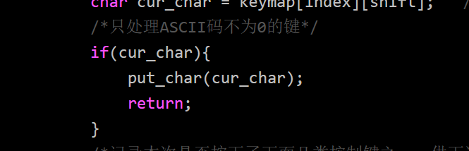 这里修改为先通过“if(!ioq_full(&kbd_buf))”判断缓冲区是否已满,如果未满则通过”ioq_putchar(&kbd_buf, cur_char)”将转换后的字符cur char加入到缓冲区中。
