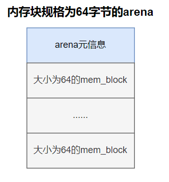 - 一部分是元信息,用来描述自己内存池中空闲内存块数量,这其中包括内存块描述符指针,通过它可以间接获知本arena所包含内存块的规格大小,此部分占用的空间是固定的,约为12字节。
