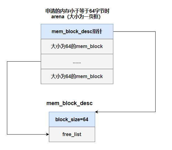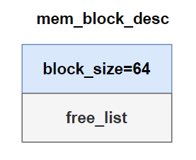 为了跟踪每个arena中的空闲内存块,分别为每一种规格的内存块建立一个内存块描述符,即 mem_block_desc,在其中记录内存块规格大小,以及位于所有同类arena中的空闲内存块链表。