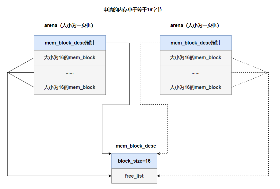 当一个arena中的内存块不够用时,需要用多个arena为同一规格内存块,此例的内存块描述符规格是16字节,因此与其关联的arena规格也必须是16字节。 当它的内存块分配耗尽时,系统又创建右边的arena(虚线表示的),从而保证该规格的内存块货源充足。