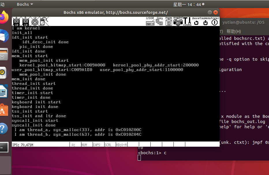 线程k_thread_a中调用 sys_malloc(33)申请33字节的内存,线程k_thread_b中调用 sys_malloc(63)申请63字节的内存。然后将返回地址转换成整型后再打印出来。