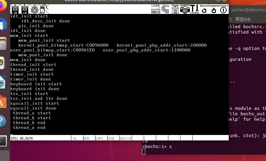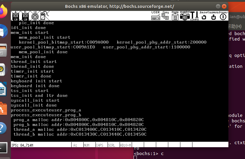 用户进程prog_a三次malloc调用,返回的地址分别是0x804800c、0x804810c、 0x804820c,它们各相差0x100,也就是差256字节,用户进程prog_b与它相同,原因是用户进程独享内 存空间,虚拟地址并不冲突。 线程thread_a调用sys_malloc后返回的地址分别是0xc013400c、0xc013410c、 0xc013420c,地址之间也是相差0x100,即256字节。 下面的线程thread_b同样调用sys_malloc,返回的 地址出现了累加的现象,在k_thread_a地址分配的基础上,从0xc013430c开始,然后依次是0xc013440c 和 Oxc013450c,原因是内核线程共享内存空间,虚拟地址必须唯一。